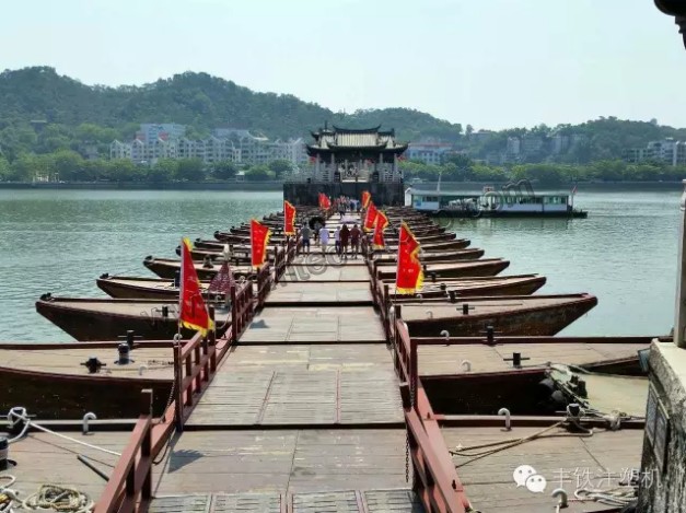 接著,我們登上了廣濟(jì)橋,該橋始于宋代,與趙州橋、洛陽(yáng)橋、盧溝橋并稱“中國(guó)四大古橋”,俗稱“湘子橋”。湘子橋?yàn)楦×航Y(jié)合結(jié)構(gòu),由東西二段石梁橋和中間一段浮橋組合而成,這是因?yàn)椤爸辛骶挠壬?,不可為墩”,只能?8只梭船并排構(gòu)成一列橫隊(duì),用鐵索連成浮橋。每遇洪水、戰(zhàn)亂或要通船,可解掉鐵索,移開梭船,即為啟閉式橋梁。湘子橋幾經(jīng)修建,雍正年間,知府鑄鉎牛二只,意在“鎮(zhèn)橋御水”。后發(fā)洪水,東墩鐵牛墜入江中,故有民謠“潮州湘橋好風(fēng)流,十八梭船廿四洲,廿四樓臺(tái)廿四樣,兩只鉎牛一只溜”。